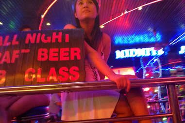 What it'll cost: Allow'south be honest, the sex testify exists to rip you off, so only go if yous accept the cash to blow. While they lure you in with the promise of drink specials, expect to get stuck with a hefty beak once the amusement starts. Getting your oil changed at a pink salon will run you about $25. As a rule of thumb, women in Patpong run a little more expensive than in Soi Cowboy.
